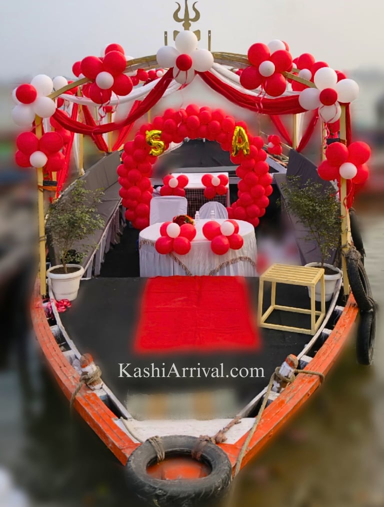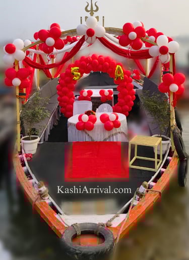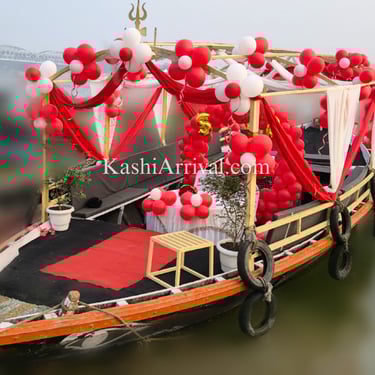 The boat is elegantly decorated with flowers, balloons, soft lights, and a romantic setup that creates a warm and intimate ambiance. As you glide over the calm waters, enjoy breathtaking views of the ghats, illuminated temples, and the magical reflection of lights on the Ganga, making every moment picture-perfect.